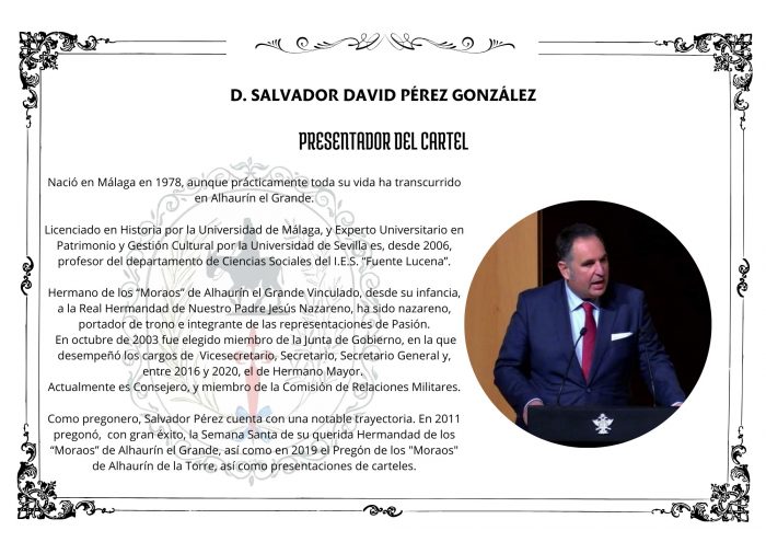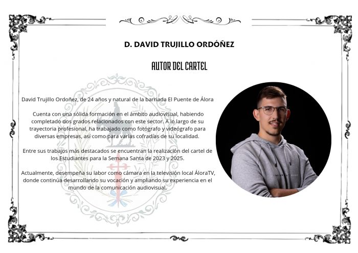 Nos complace anunciar que la Junta de Gobierno ha designado como presentador del cartel anunciador de nuestras salidas procesionales a D. Salvador David Pérez González. Asimismo, se ha elegido a D. David Trujillo Ordóñez para realizar el cartel de nuestra Estación de Penitencia en la Semana Santa del 2026.